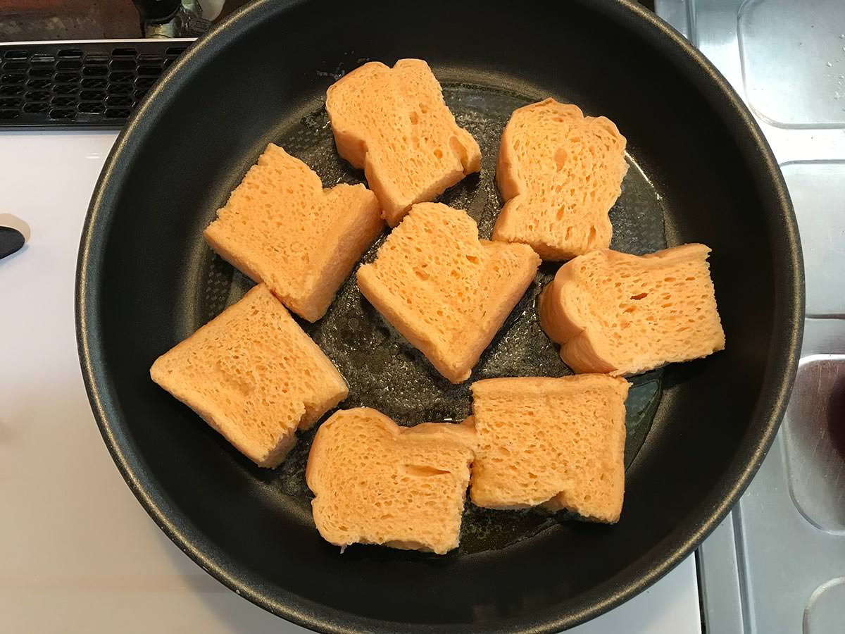パンの耳を切り落としてから、たまご液を吸わせると、もっとふわふわになるのだとか。